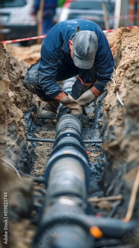 Workers are water pipes with PVC outdoors. Industrial Trench for water supply