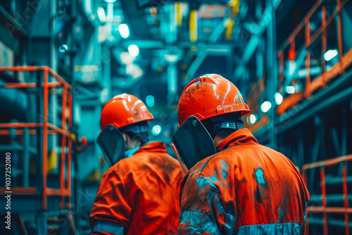 Workers wearing industrial uniforms and Welded Iron Mask at Steel welding plants, industrial safety first concept.