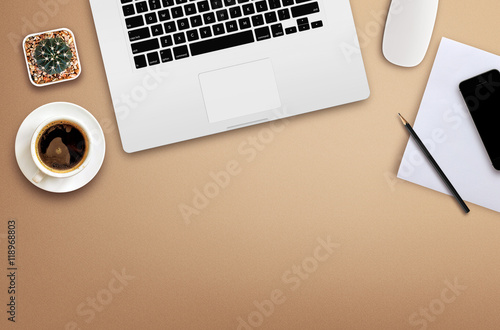 workplace with blank screen smartphone, tablet, coffee cup, paper and notebook on wooden table. top view with copy space. over light