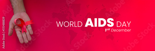 World AIDS Day Background with abstract world map and Hand holding a Red AIDS Ribbon isolated on red background