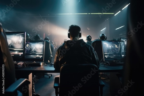 World Cup.Cybersport team involved in online tournament in gaming club . Team of professional cybersport gamers in gaming tournament Generative AI