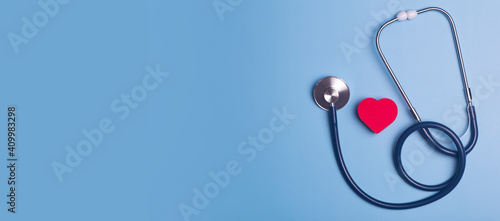 World heart day banner background. Heart as a symbol of health, treatment, charity, donation and cardiology on a blue background with a medical statoscope.