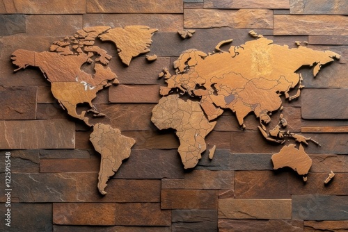 world map is drawn on a brick wall. A large map for exploring countries and cities, home decor. geography, geography, tourist destinations