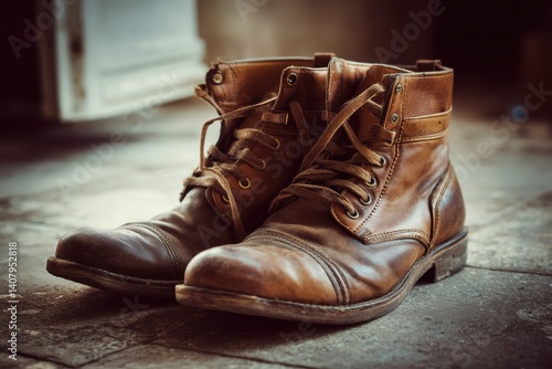 Worn leather boots resting on a dusty floor with vintage tones and shallow depth of field