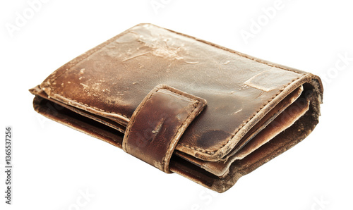 Worn leather wallet, vintage style, showing signs of age and use, textured surface, folded design, brown color, isolated on transparent background, png