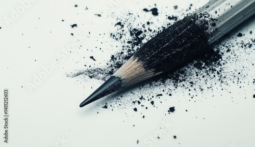 Worn pencil with graphite debris. Close-up of a used pencil point, its lead shattered and scattered across a white surface