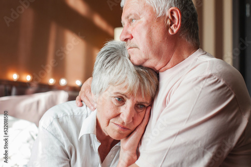 Worried senior woman embracing upset old man