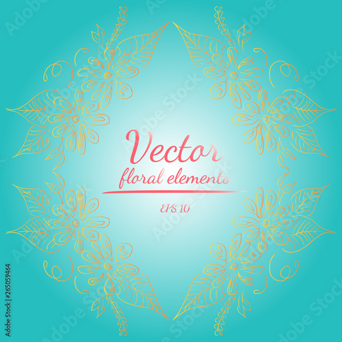 Wreath of roses or peonies flowers with light sea green, sunshade, living coral, yellow and white colors. Floral frame design elements for invitations and greeting cards. Hand drawn. Line art. Sketch.