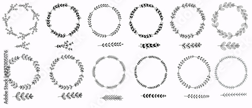 Wreath with leaves vector. Hand drawn branches with leaves. Black and white ornaments vintage. Illustrations wreath invitation