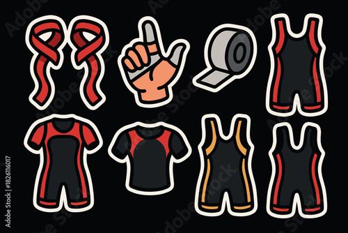 Wrestling gear and tape stickers featuring suits, hand gesture, tape roll on black background