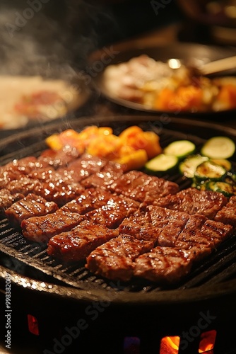 Yakiniku - Japanese barbecue where diners grill their own meat and vegetables over a tabletop grill, dipping into various sauces.