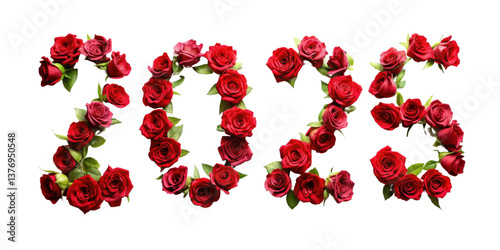 Year 2025 number made of red roses isolated on transparent background