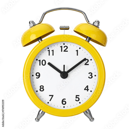 Yellow alarm clock with white face, black hands, ringing bells