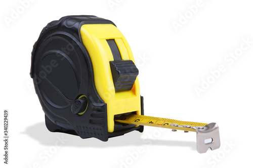 Yellow and Black measuring tape on white background with Drop Down Shadow, Side View. COPY SPACE.