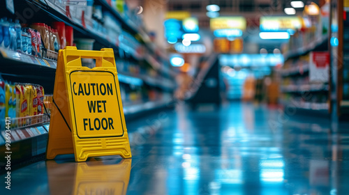 yellow CAUTION WET FLOOR sign on grocery store floor