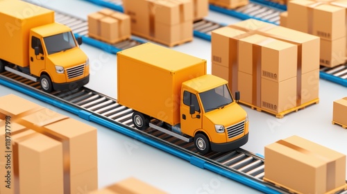Yellow Delivery Trucks Transporting Boxes on Conveyor Belt System