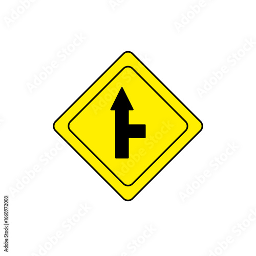 Yellow diamond-shaped road warning sign showing a straight road with a T-intersection from the right. Indicates a side road joins from the right side