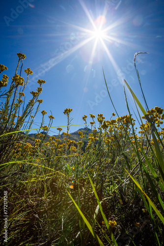 Yellow flowers and sunrise in the mountains