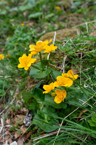 Yellow flowers in the woods in spring