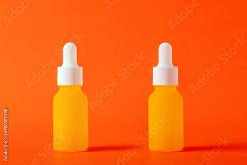 Yellow glass cosmetic bottle, Skin care or sunscreen cosmetic on orange background.