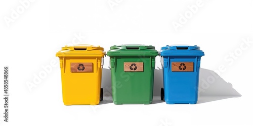 Yellow, green, and blue recycle bins used for waste separation, serving as a background for environmental signage, Earth Day
