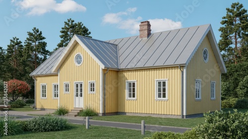 Yellow house architecture design with gray metal roof and green grass landscape in summer sunny day view exterior