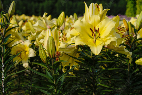 Yellow lilies. Lilium 'Terrasol' in the garden after the rain. OT-hybrid lily. Oriental lily x trumpet lily.