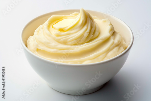 yellow mashed potatoes in a white bowl on a white background