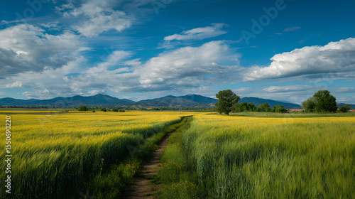 Yellow Path Through Green Wheat Fields Leading to Distant Mountains Under Blue Sky
