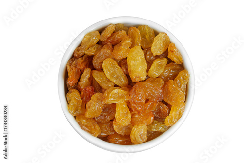 Yellow Raisins in ceramic bowl isolated on white background. Top view. Flat lay