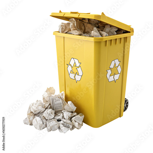 Yellow recycling bin overflowing with crumpled paper isolated on transparent background