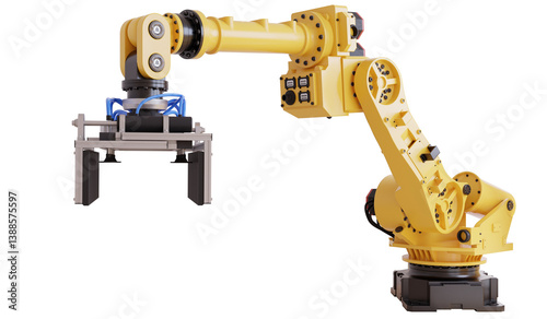 Yellow robotic arm with gripper standing on transparent background- 3D rendering