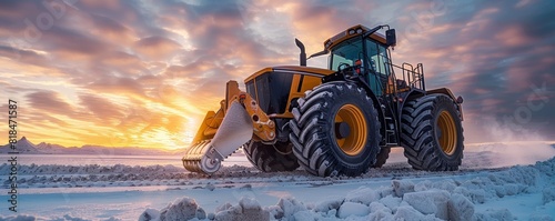 Yellow snowplow tractor clearing a snowy road at sunset, with dramatic clouds and mountain backdrop, illustrating winter work machinery.