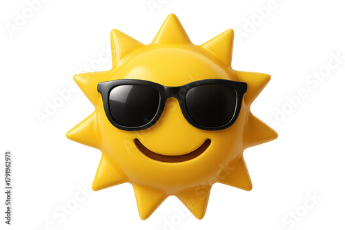 Yellow sun emoji wearing cool sunglasses for summer fun and happy weather forecasts on transparent background