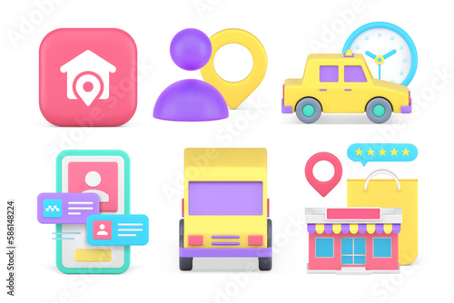 Yellow taxi cab order online shopping delivery smartphone application set 3d icon realistic vector