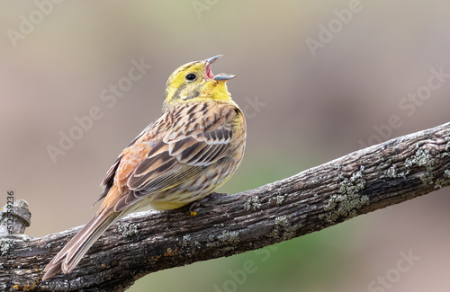 Yellowhammer, Emberiza citrinella. The male bird sings while sitting on a beautiful branch