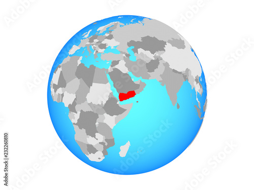 Yemen on blue political globe. 3D illustration isolated on white background.