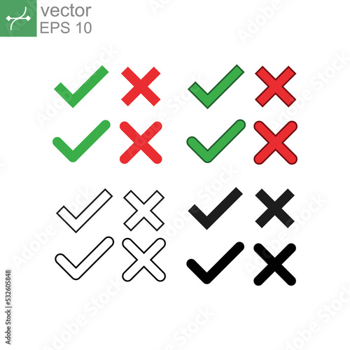 Yes or no tick choose sign. Approve and reject answer for confirm concept. Correct and cross vote choose check. Checkmark cross icon set. Vector illustration. Design on white background. EPS 10