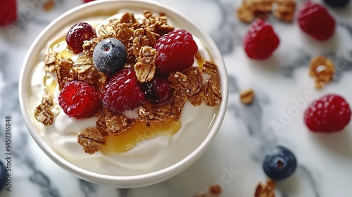 Yogurt bowl with granola, raspberries, blueberries, honey on marble surface.