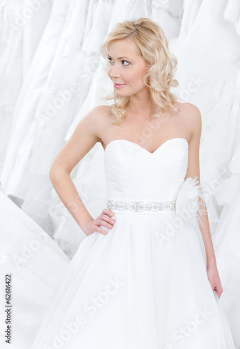 Youg girl is trying on a beautiful wedding gown