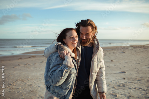 Young adult couple walking on a beach during cold weather