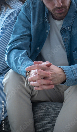 Young adult man and woman sitting apart on the couch at home, deeply sad, struggling with economic hardship, job insecurity, rising bills, trust issues, infidelity, and an impending breakup