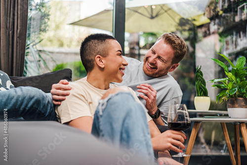 Young adult persons couple enjoying themselves and having great time at home casual atmosphere drinking wine smiling laughing happy feelings joy relaxed