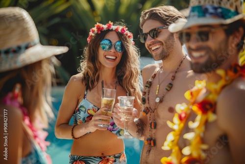 Young adults in Hawaiian outfits gathered around a pool, celebrating with drinks and laughter, epitomizing the carefree spirit of summer.