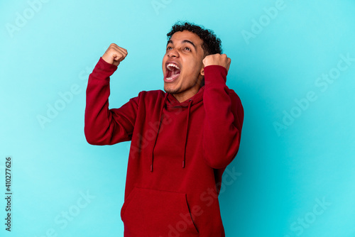 Young african american curly man isolated on blue raising fist after a victory, winner concept.