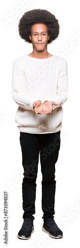 Young african american man with afro hair wearing glasses Smiling with hands palms together receiving or giving gesture. Hold and protection