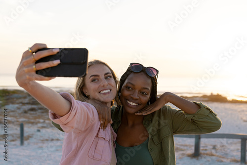 Young African American woman and young Caucasian woman capture a selfie at sunset