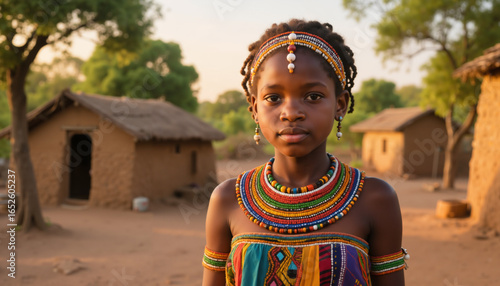 Young African girl standing in traditional attire in village at sunset , with traditional head beads