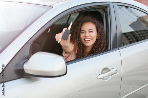 Young African-American woman with key sitting in new car