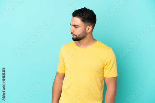 Young arab man isolated on blue background looking to the side